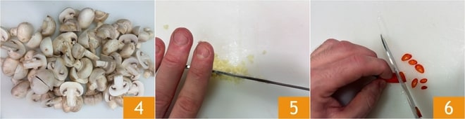 Reserve os cogumelos 4. Limpe e pique finamente o alho 5, corte a pimenta fresca em rodelas 6.