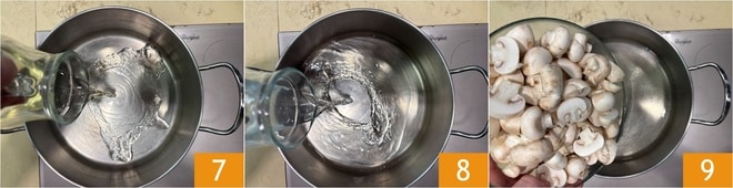 Em uma panela, aqueça o vinagre 7 e a água 8; assim que começar a ferver, mergulhe os cogumelos 9 e adicione sal.