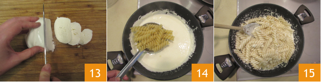 Enquanto a massa cozinha, corte a mussarela fatiada 13. Uma vez cozidos, escorra os fusilloni diretamente no molho de Pecorino 14 e em fogo médio-baixo mexa para dar sabor 15.
