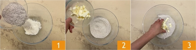 Para preparar a galette com batatas e queijo, coloque as farinhas na tigela 1, adicione sal e misture. Acrescente a manteiga fria em cubos 2, e misture rapidamente com a ponta dos dedos 3 como se estivesse beliscando a massa.