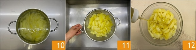 Após o tempo 10, escorra as batatas 11 e deixe amornar. Tempere as batatas com óleo e sal 12.
