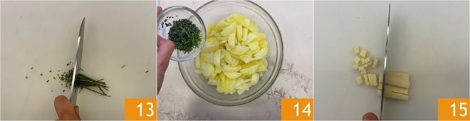 Pique as ervas aromáticas 13 e adicione às batatas para aromatizá-las 14. Corte o queijo em cubos de cerca de 0,5 cm 15.