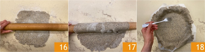 Retire a massa brisée da geladeira, polvilhe a superfície de trabalho com farinha de trigo sarraceno, abra a massa até uma espessura de cerca de 0,3 mm 16. Em seguida, enrole a massa no rolo e desenrole-a sobre uma forma cônica (base inferior 22 cm, base superior 26 cm) forrada com papel manteiga. Fure a base com um garfo 18.