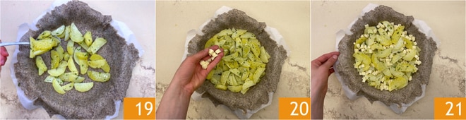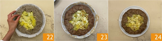 Belisque a massa para selá-la 22, depois asse em forno estático a 200°C por 20 minutos. Continue assando em modo ventilado por mais 15 minutos. Retire do forno 23 e deixe esfriar antes de desenformar e servir a galette com batatas e queijo 24.