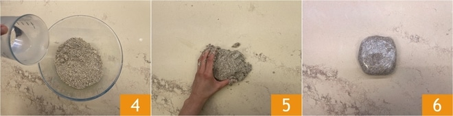 Adicione a água fria e misture rapidamente na tigela 4. Quando a massa começar a ganhar consistência 5, transfira para a bancada e amasse brevemente 5, até obter uma massa homogênea. Forme um bloco, envolva em filme plástico 6 e deixe descansar na geladeira por 30-40 minutos.