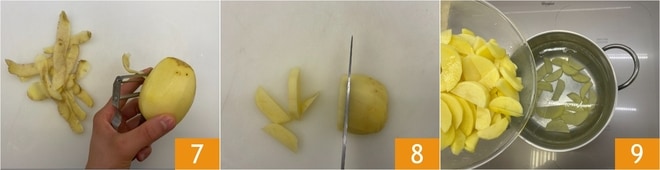 Descasque as batatas 7 e corte-as ao meio e depois em fatias de meio centímetro 8. Cozinhe as batatas em bastante água fervente com sal por cerca de 10 minutos 9.