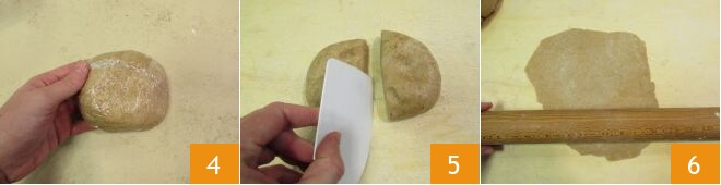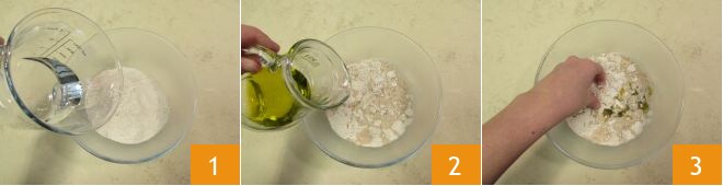 Para preparar as galettes de espelta com camembert e cebolas ao Bordeaux, comece pela massa. Em uma tigela, coloque a farinha de espelta integral e a água 1, depois o óleo 2, o sal e comece a amassar 3