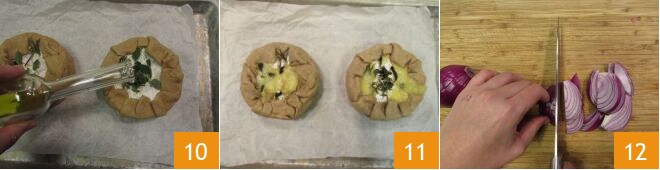 Faça o mesmo com a outra parte da massa e feche. Em seguida, coloque as galettes em uma assadeira forrada com papel manteiga e regue a superfície com um fio de óleo 10. Asse em forno ventilado, já aquecido a 180°, por cerca de 25-30 minutos + alguns minutos no grill 11. Enquanto isso, você pode cuidar das cebolas, descasque-as e corte-as finamente 12,