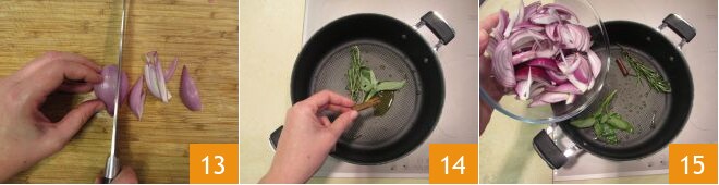 faça o mesmo com as chalotas 13. Bem, vá para o fogão. Em uma panela, aqueça um fio de óleo junto com sálvia, alecrim e canela 14. Após alguns minutos, adicione as cebolas e as chalotas e continue cozinhando por alguns instantes 15