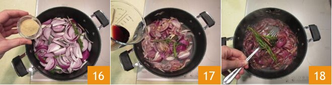 antes de adicionar o açúcar e deixá-lo caramelizar 16. Refresque com o Bordeaux e deixe cozinhar por 10 minutos 17. No final do cozimento, remova os aromas e deixe esfriar 18.