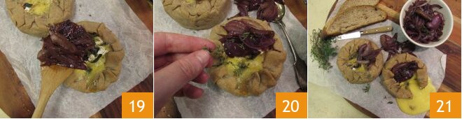 Neste ponto, você deve ter tudo pronto, tanto as galettes quanto as cebolas. Nas galettes levemente mornas, coloque parte das cebolas 19, decore a superfície com tomilho 20 e sirva suas galettes de camembert e cebolas ao Bordeaux acompanhadas com mel e frutas 21.
