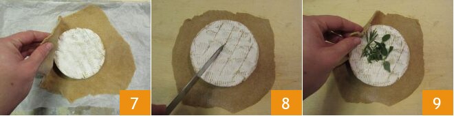 No meio da folha, coloque uma forma de queijo 7, faça cortes superficiais 8 e depois perfume com sálvia, orégano e alecrim 9.