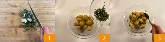 Para preparar a galinhola recheada, primeiro prepare uma mistura com alecrim, sálvia e os dentes de alho descascados 1. Lave as batatas novas, seque-as e, se forem muito grandes, corte-as ao meio sem descascá-las. Transfira-as para uma tigela, tempere com sal, óleo e metade da mistura aromática 2. Misture bem 3.