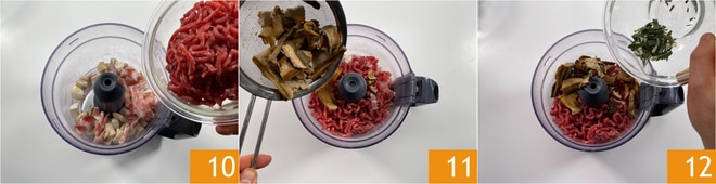 Neste ponto, coloque em um processador de alimentos com lâminas os cogumelos champignon, a pancetta, a carne moída 10, os porcini secos já reidratados e escorridos 11 e quase toda a mistura aromática restante 12. Adicione também uma pitada de sal, mas sem exagerar.