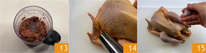 Bata bem até obter uma mistura homogênea 13. Pegue a galinhola e certifique-se de que não há penas, caso contrário, queime-as com um maçarico 14 ou passe a galinhola na chama do fogão. Salgue tanto o interior quanto a pele da galinhola 15, massageando bem para que o sal penetre também no interior.