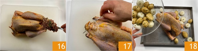 Recheie-a com o recheio recém-preparado 16 e, com agulha e barbante de cozinha, feche a parte inferior 17, para que o recheio não saia durante o cozimento. Coloque a galinhola em uma assadeira e distribua ao redor as cebolinhas e batatas 18.