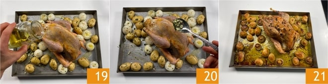 Tempere a galinhola com um fio de óleo 19 e adicione a mistura restante 20. Asse em forno a 200°C por 20 minutos, depois regue a galinhola com o caldo e continue o cozimento por mais 70 minutos, abaixando o forno para 180°C. Neste ponto, retire a galinhola recheada do forno 21 e deixe descansar por alguns minutos antes de servir.