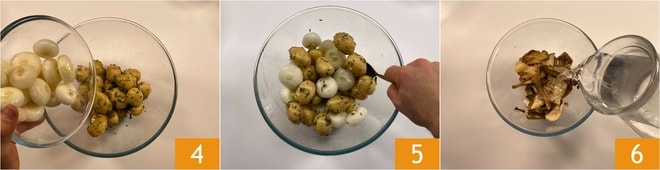 Adicione também as cebolinhas borettanas 4 e misture novamente 5. Reserve e passe ao recheio da sua galinhola. Em uma tigelinha, coloque os cogumelos porcini secos e cubra-os com água 6.