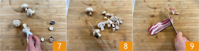 Enquanto isso, limpe os cogumelos champignon com um pano úmido, eliminando a base com uma faca 7. Em seguida, corte-os em pedaços 8. Corte também a pancetta em cubos 9.