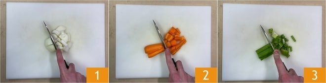 Para preparar os camarões com bacon, limpe a cenoura e corte-a em pedaços grandes 1, faça o mesmo com a cenoura 2 e o aipo 3.