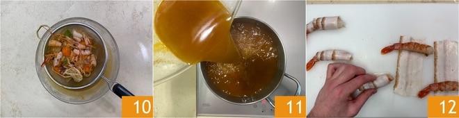Ao final do cozimento, coe o caldo 10, coloque-o de volta no fogo 11 e deixe reduzir, levará cerca de 20-30 minutos. Coloque as fatias de bacon em uma tábua, posicione o camarão em uma extremidade e enrole-o no bacon 12. Proceda da mesma forma para todos.
