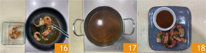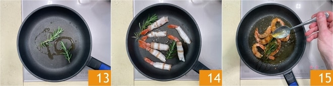 Em uma frigideira antiaderente, aqueça um pouco de óleo, tempere com um ramo de alecrim 13 e coloque os camarões 14. Cozinhe em fogo alto de ambos os lados até dourar, regando os camarões aos poucos com o caldo de cozimento 15.