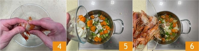 Limpe os camarões, retire a cabeça e elimine o intestino com um palito de dentes 4. As cascas serão usadas para fazer o caldo: em uma panela, aqueça um fio de óleo, adicione os legumes 5 e as cascas 6.