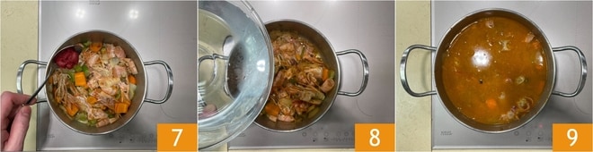 Tempere com o extrato de tomate 7 e toste tudo por alguns instantes, depois adicione água até cobrir 8 e cozinhe por 30 minutos 9.
