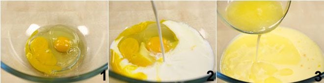 Para preparar a massa das gaufres, comece colocando os 2 ovos em uma tigela grande 1, misture com uma colher de pau, depois adicione o leite 2 e a manteiga derretida 3.