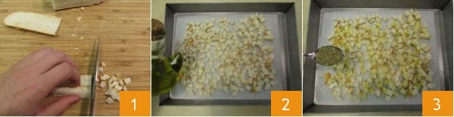 Para fazer o gazpacho à mediterrânea, primeiro corte o pão em pequenos cubos 1, distribua-os em uma assadeira forrada com papel manteiga e tempere com óleo 2, sal e orégano seco 3.