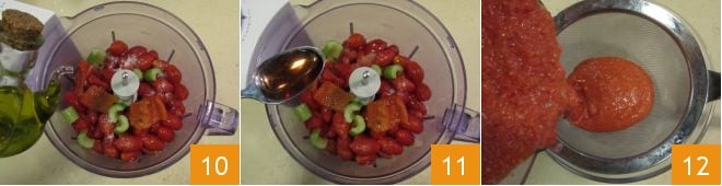 Neste ponto, tempere com o azeite de oliva 10, o sal e o vinagre 11. Bata a mistura até obter um purê, passe-o por uma peneira 12