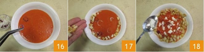 Coloque o gazpacho no prato de servir, decore com anéis de cebolinha 16, os croutons de pão tostado 17 e pedaços de ricota 18.