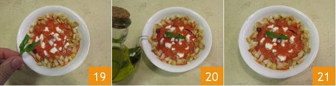Perfume o prato com folhas de manjericão fresco 19 e tempere com um fio de azeite de oliva cru 20. Sirva imediatamente o gazpacho à mediterrânea 21!