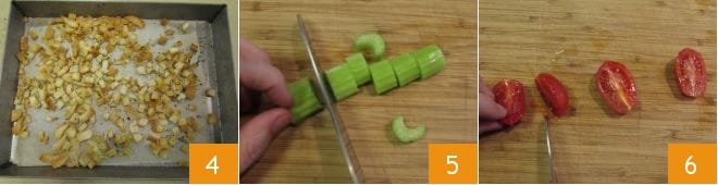Toste o pão em forno ventilado a 220° por 4 minutos ou até que esteja bem dourado 4. Agora lave o aipo, retire a base e corte-o em pequenos pedaços 5. Lave os tomatinhos e corte-os ao meio 6.