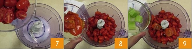 Coloque os tomatinhos em um mixer 7, adicione os pimentões escorridos 8 e o aipo 9.
