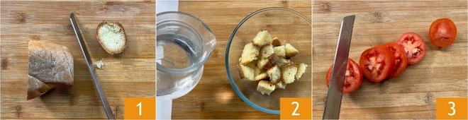 Para preparar o gazpacho andaluz, primeiro corte o pão dormido em pedaços 1, transfira-o para uma tigela e cubra com 150 g de água 2. Deixe de molho por alguns minutos enquanto prepara o resto dos ingredientes: lave e corte os tomates em fatias 3.