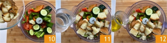Adicione também o pão embebido e espremido 10, depois despeje os 250 g restantes de água fria 11 e o azeite 12.