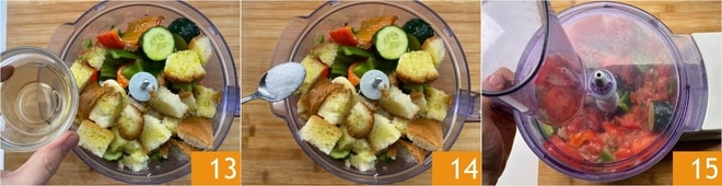 Por último, adicione o vinagre 13, o sal 14 e a pimenta. Feche e bata por cerca de 30 segundos 15.