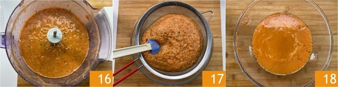 Quando obtiver uma mistura homogênea 16, transfira-a para um coador de malha fina que você terá colocado sobre uma tigela e pressione com uma espátula para peneirar 17. Desta forma, você eliminará os resíduos das cascas e obterá uma consistência lisa e fluida 18. Deixe descansar na geladeira por pelo menos 2 horas, coberto com filme plástico.