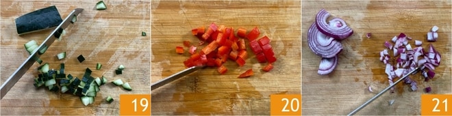 Após o tempo de descanso, prepare os ingredientes para a decoração: corte em cubos o pepino 19, o tomate 20 e a cebola roxa 21.