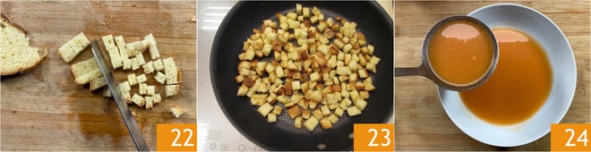 Reduza a cubos também o pão 22 e toste-o na frigideira 23. Agora, retire o gazpacho da geladeira e despeje nos pratos 24.