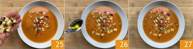 Decore com os vegetais e os cubos de pão tostado 25, depois tempere com um fio de azeite 26 e uma pitada de pimenta. Seu gazpacho andaluz está pronto para ser saboreado 27!