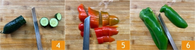 Faça o mesmo com os pepinos sem descascá-los 4. Finalmente, limpe os pimentões e corte-os em pedaços, tanto os vermelhos 5 quanto os verdes 6.