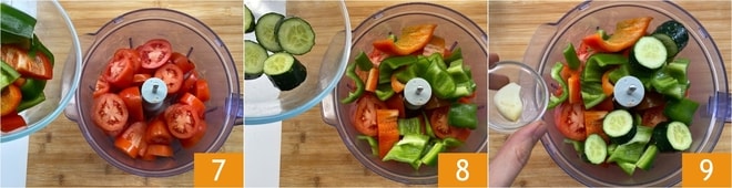 Coloque os tomates em um liquidificador, depois adicione os pimentões 7, os pepinos 8 e o dente de alho 9.