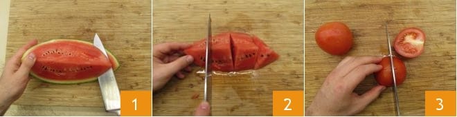 Para preparar o gazpacho de melancia, comece pela limpeza da fruta. Depois de remover a casca 1, corte a polpa em pedaços (você precisará de 450 g) 2 e coloque em uma tigela. Passe para os tomates: separe-os do galho, lave-os, seque-os e corte-os em pedaços, removendo o pedúnculo 3.