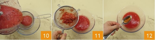 Acione as lâminas e obtenha um purê. Transfira para um recipiente com uma peneira dentro 10 e coe desprezando os resíduos de cascas e sementes 11. Tempere com vinagre de vinho tinto 12,