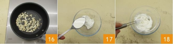 Toaste as amêndoas em uma frigideira por alguns minutos e reserve 16. Finalmente, prepare um creme de queijo misturando o creme de leite 17 com o queijo de cabra, misture bem e transfira para um saco de confeitar 18.