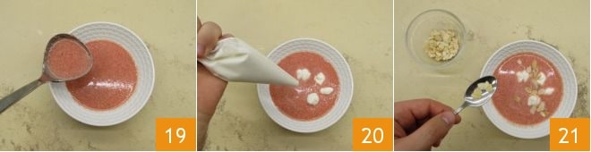 Despeje a mistura em um prato fundo 19 e decore com algumas porções de queijo de cabra 20, as lâminas de amêndoa 21