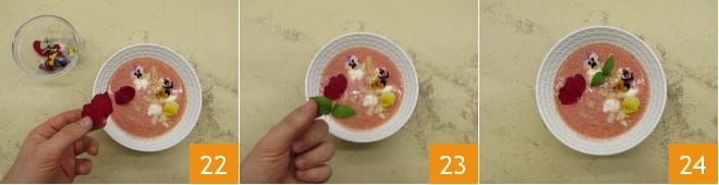 e algumas flores comestíveis 22. Finalmente, uma folhinha de hortelã 23 e seu gazpacho de melancia está pronto, basta servi-lo frio 24!