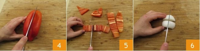 Em seguida, limpe o pimentão 4 e corte também em pedaços grandes 5. Limpe a cebola, picando-a grosseiramente também 6.